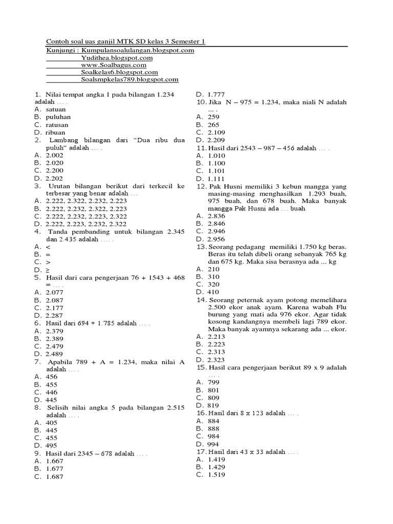 Contoh Soal Matematika Kelas 3 Sd Semester 1